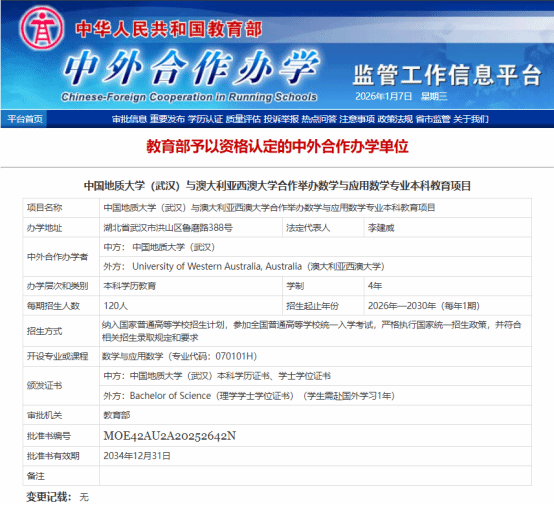 学校党委始终将国际化办学作为重要发展战略,高度重视对外教育合作交流。2025年3月起,数学与物理学院在国际合作处、本科生院、校办公室法规办,财务与资产管理部等职能部门的大力指导和支持下,组建专业专家团队系统谋划、周密组织,召开多轮内外专题研讨,并远赴澳大利亚,对西澳大学开展实地考察与深度交流,为合作项目的顺利推进筑牢基础。在学校领导的统筹部署与悉心指导下,在历经多轮磋商谈判、材料打磨与申报筹备,成功攻克各项难点,推动项目顺利通过教育部审批。该项目的落地,将搭建起中澳数学学科领域人才联合培养、学术科研协同创新、教学实践互鉴的优质平台。同时,依托这一合作纽带,还将推动两校在地质学、地质资源与地质工程等优势学科领域的深度交叉融合,为拓展更广泛的学术合作与人才联合培养空间奠定坚实基础。