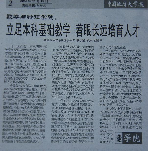 在2013年11月15日第451期的中国地质大学报的“走近学院”专栏中,刊登了一篇题为“数学与物理学院:立足本科基础教学 着眼长远培育人才”的专题报道,现把详细内容转载如下。
