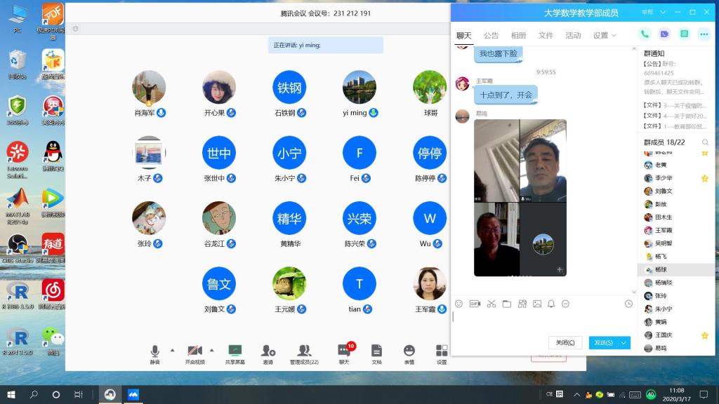 根据教育部和学校在当前疫情条件下“停课不停教”,“停课不停学”的要求,自2月10日始,我院承担全校的近270门次本科生课程均开展了线上教学。为进一步提高在线教学质量,保证教学秩序,2020年3月16日至17日,数学与物理学院六个系(部、中心)分别在腾讯会议平台召开了云端教学工作视频会议,就疫情防控期间新学期线上教学相关工作做进一步交流、讨论和部署。全院96名任课教师参加了此次线上教学会议和讨论,郭上江院长、吴太山书记、徐超副书记、黄刚副院长、张光勇副院长、教务科张世中和石铁钢老师全程参加了各个系(部、中心)的分组会议。