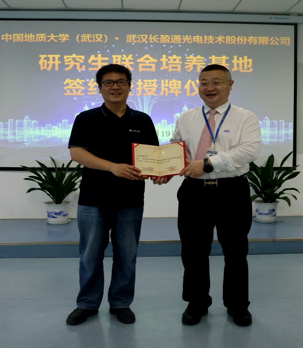 学院党委书记吴太山与武汉长盈通光电技术股份有限公司董事长兼总裁皮亚斌完成合作协议的签约仪式,并为武汉长盈通光电技术股份有限公司授予“实习实践基地”牌匾。