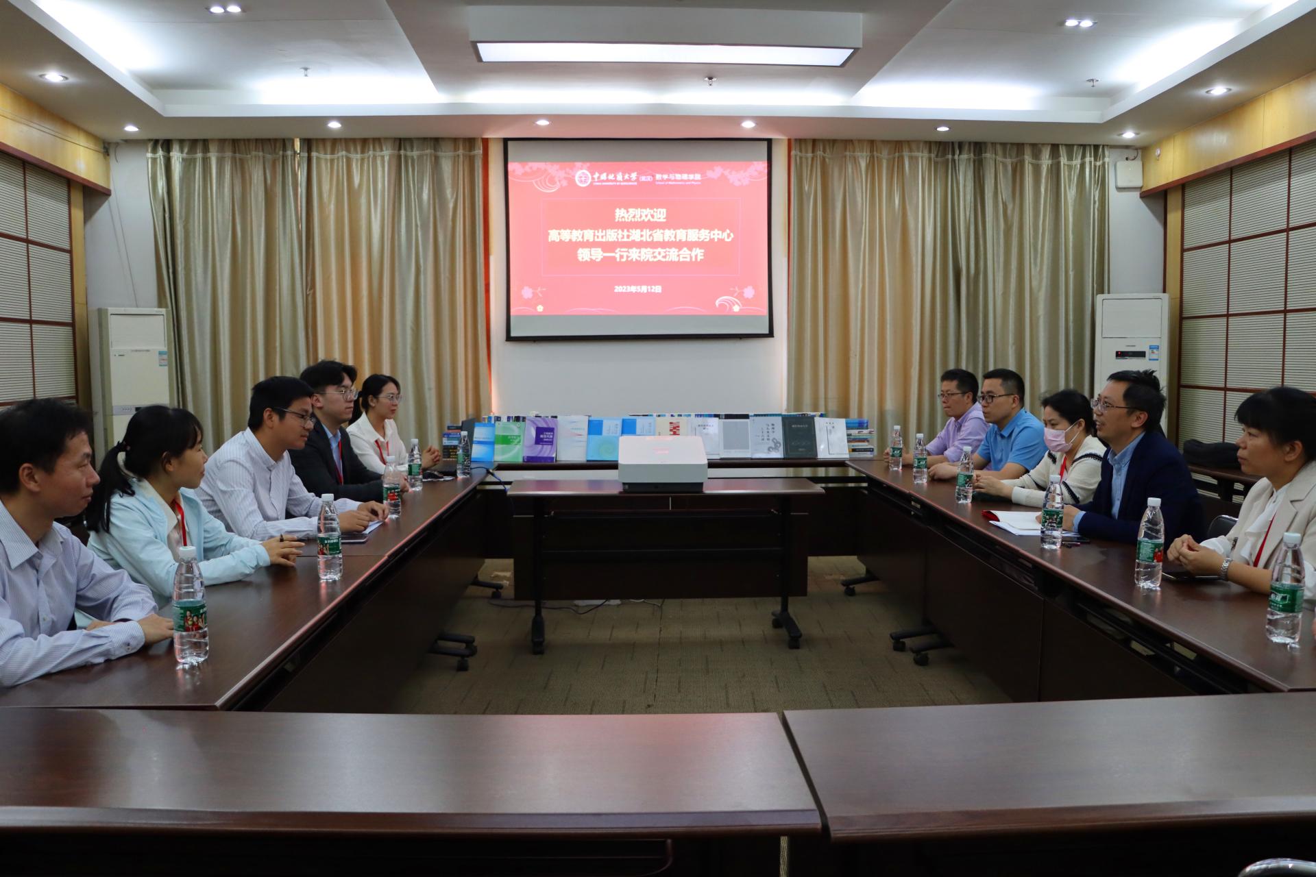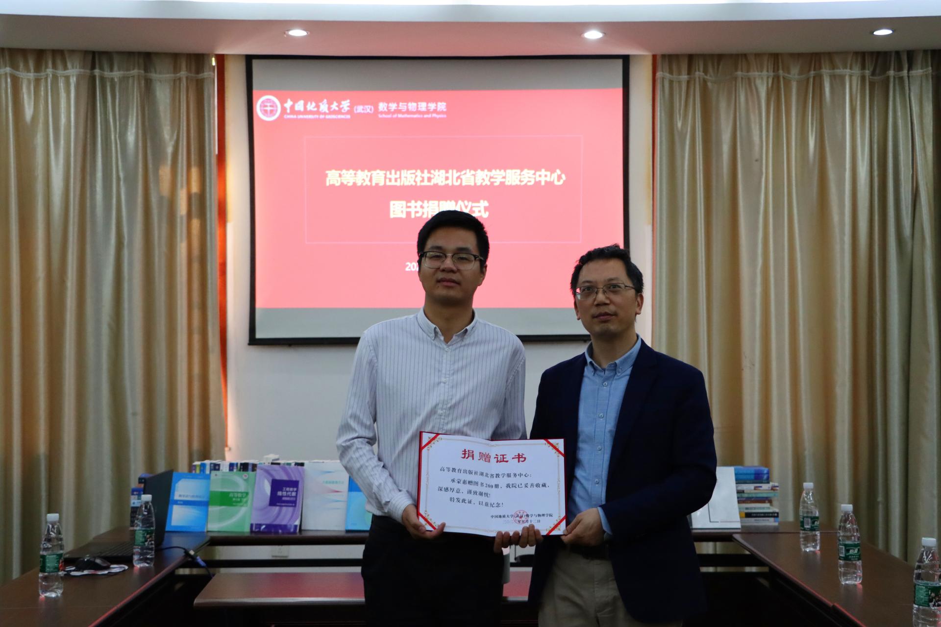 5月12日下午,高等教育出版社湖北省教学服务中心副主任叶望一行来williamhill威廉希尔数学与物理学院调研交流,并向学院捐赠图书200余册。捐赠仪式在迎宾楼第四会议室召开,我院副院长黄刚等参加仪式。