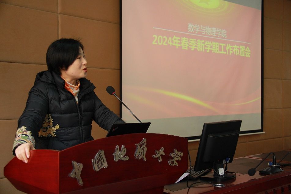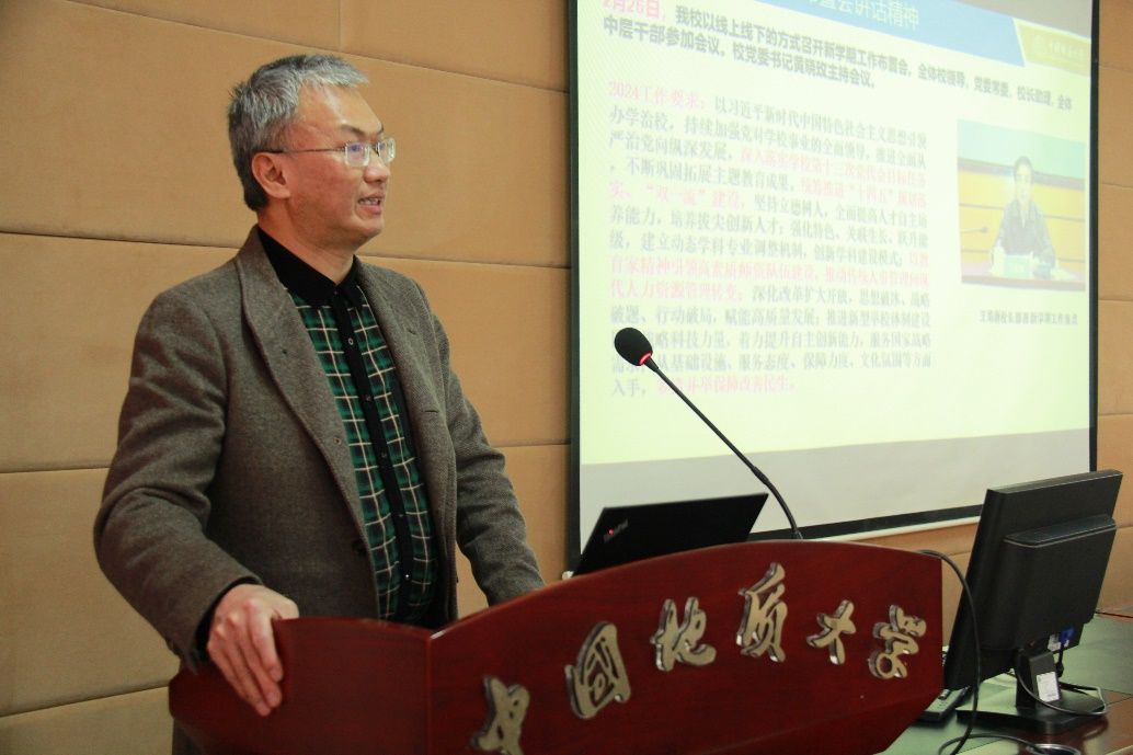 接下来,院长郭上江传达了王焰新校长在春季新学期工作布置会上的讲话精神,介绍了学校2024年工作要点,并对学院全年重点工作进行了安排部署。他要求全院师生要在认真落实学校工作要求的基础上,继续做好博士点申报后续工作,坚决打赢博士学位点建设的攻坚战,切实加强数学、物理公共基础课程建设,努力为建设地球科学领域国际知名研究型大学做出新贡献。