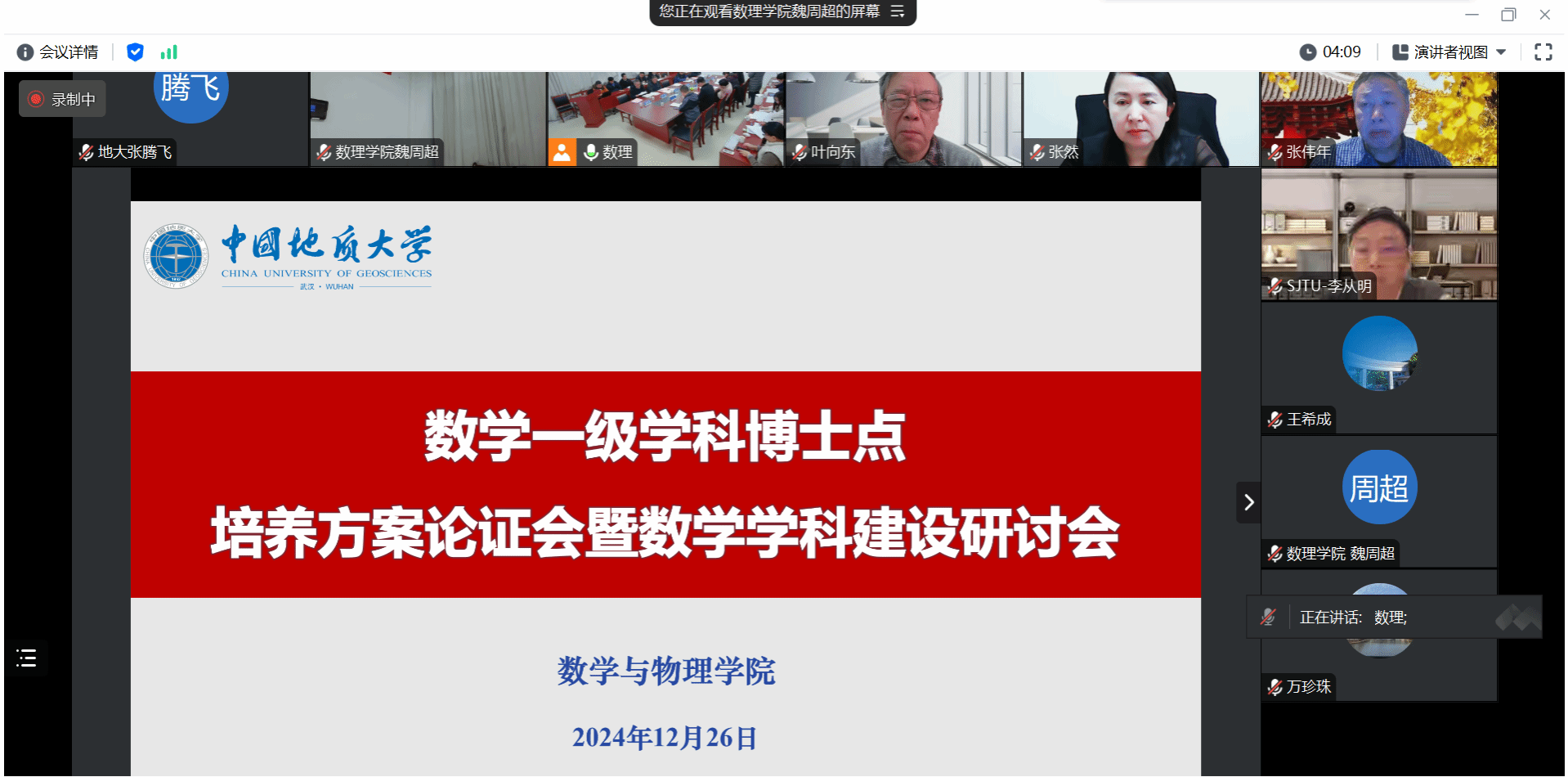 易明首先介绍学校博士点培养方案制定的背景和相关编制工作安排,魏周超随后从指导原则、学科简介、学科研究方向与特色、培养目标、修业年限与课程设置、必读经典著作、专业学术期刊和网站、科研能力及素质、学位论文及学术成果要求等方面详细汇报学院数学一级博士点培养方案的制订情况。