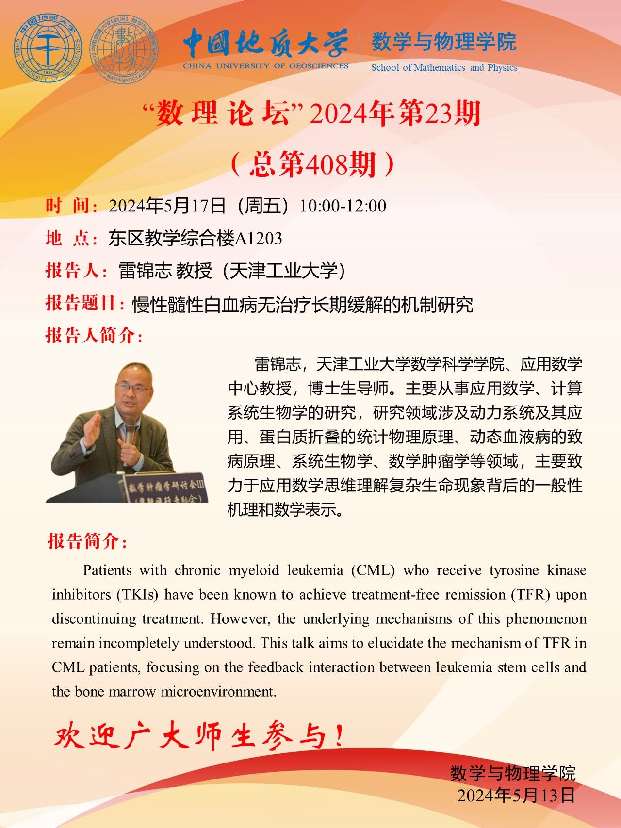 2024年5月17日雷锦志教授学术讲座:慢性髓性白血病无治疗长期缓解的机制研究