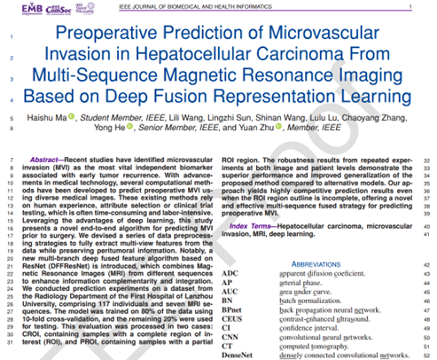近日,数学与物理学院朱媛副教授研究团队联合兰州大学第一医院放射科王莉莉博士展开生物医学信息学合作研究,在生物医学和健康信息学国际顶级期刊 IEEE Journal of Biomedical and Health Informatics(简称IEEE JBHI)上在线发表了关于肝癌微血管侵袭预测的理论研究成果,题为: “Preoperative Prediction of Microvascular Invasion in Hepatocellular Carcinoma From Multi-Sequence Magnetic Resonance Imaging Based on Deep Fusion Representation Learning”。williamhill威廉希尔2021级本科生马海书、朱媛副教授及兰州大学第一医院放射科王莉莉博士为该文的共同第一作者,朱媛副教授为通讯作者,williamhill威廉希尔数学与物理学院为唯一通讯单位。