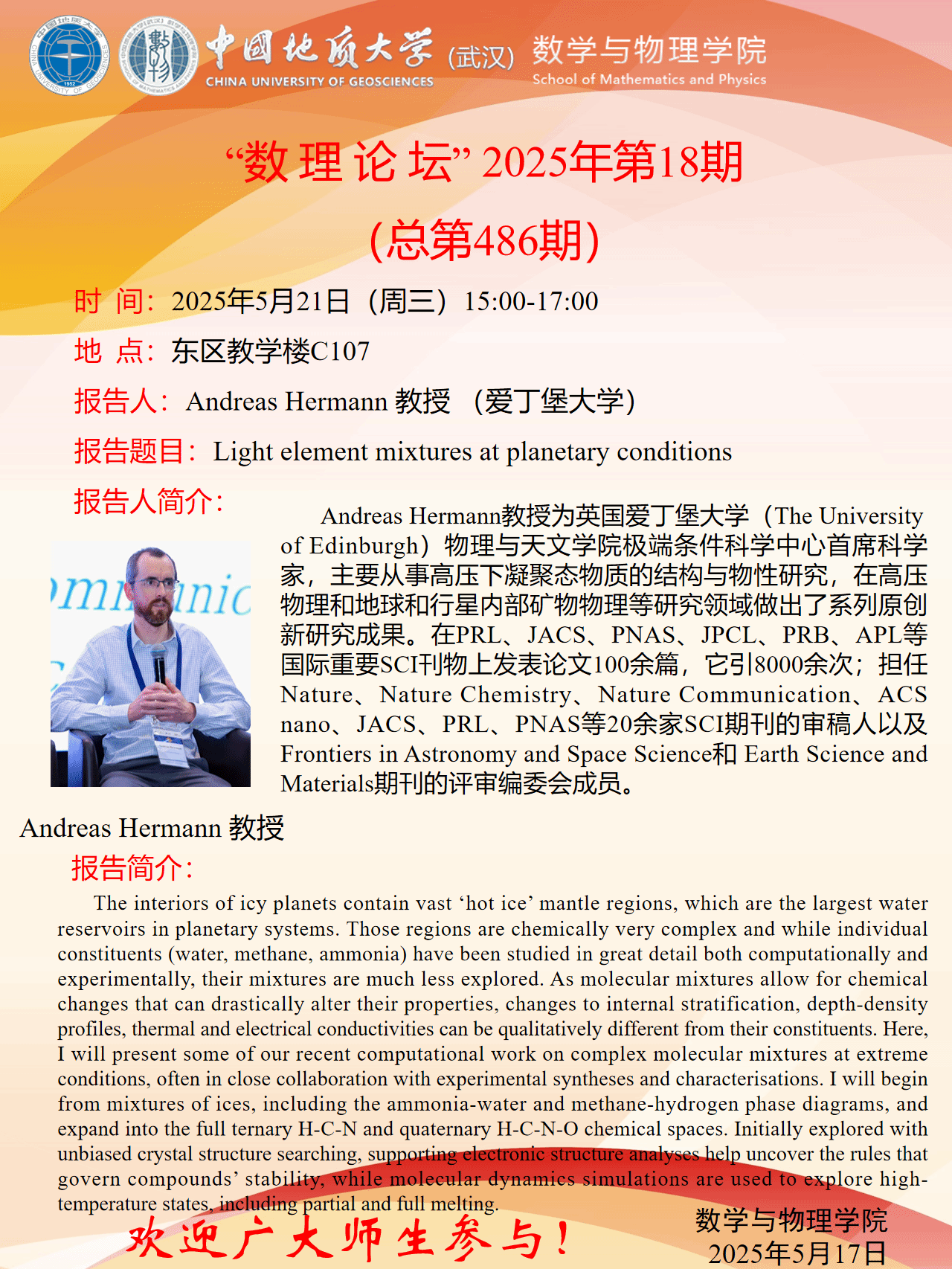 2025年5月21日Andreas Hermann教授学术报告:Light element mixtures at planetary conditions