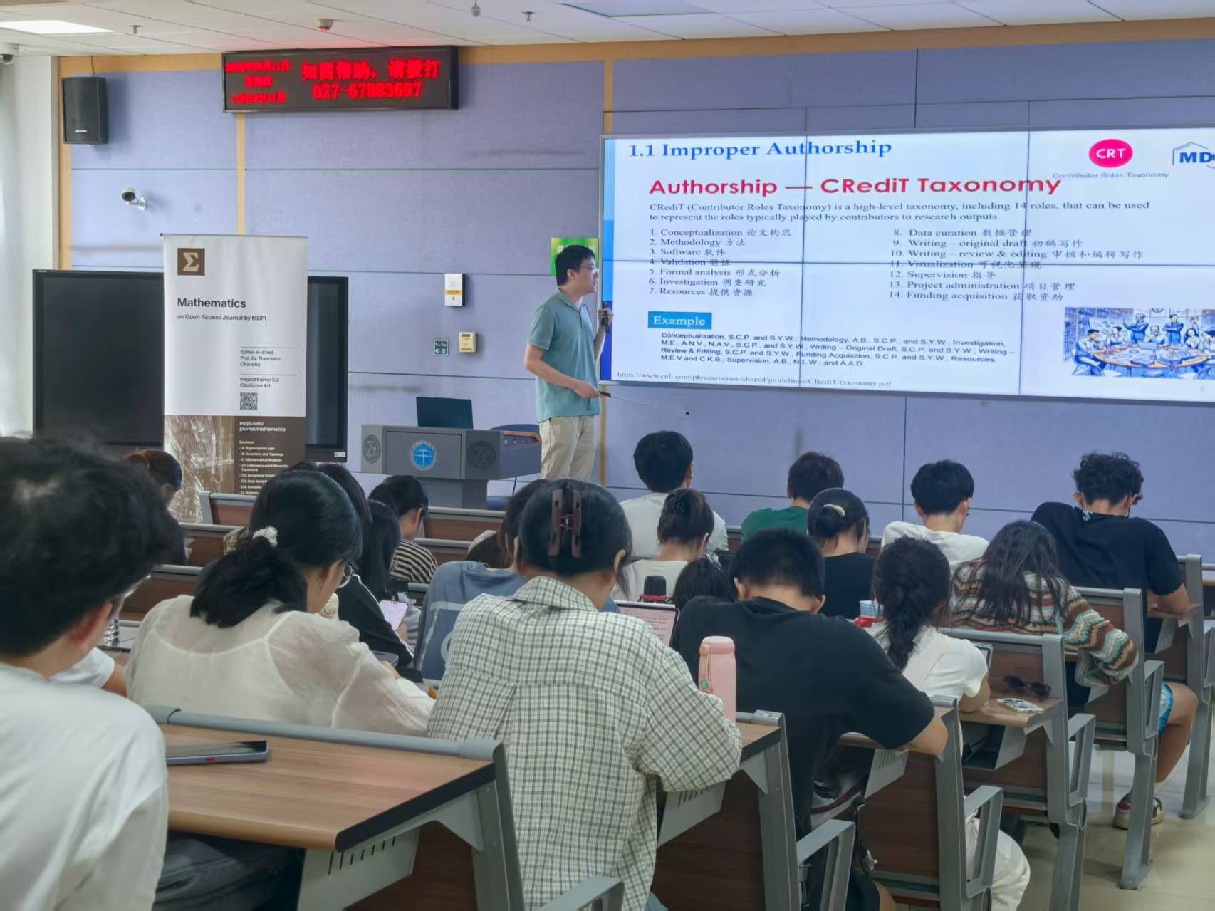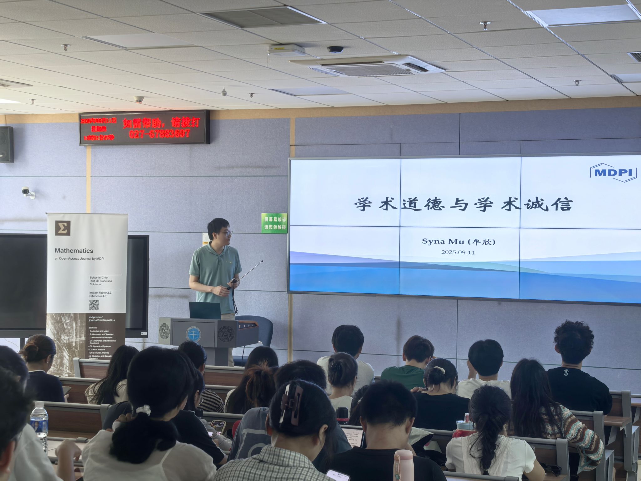 学院特邀MDPI武汉科技服务有限公司牟欣博士以“学术道德与学术诚信”为主题,结合多年学术出版工作经验,从三个维度展开深入讲解。首先,通过国际国内典型案例,生动剖析了数据造假、论文抄袭、一稿多投等学术不端行为的严重危害,强化新生“学术诚信无小事”的认知。其次,系统介绍了学术论文写作规范,包括文献引用标准、作者署名规范、利益冲突声明等实用知识。最后,通过一些案例为同学们未来发表高水平论文提供了专业指导。同时,牟博士介绍该公司可以提供编辑助理、学术翻译等实习岗位,为新生搭建“学习-实践-成长”平台。