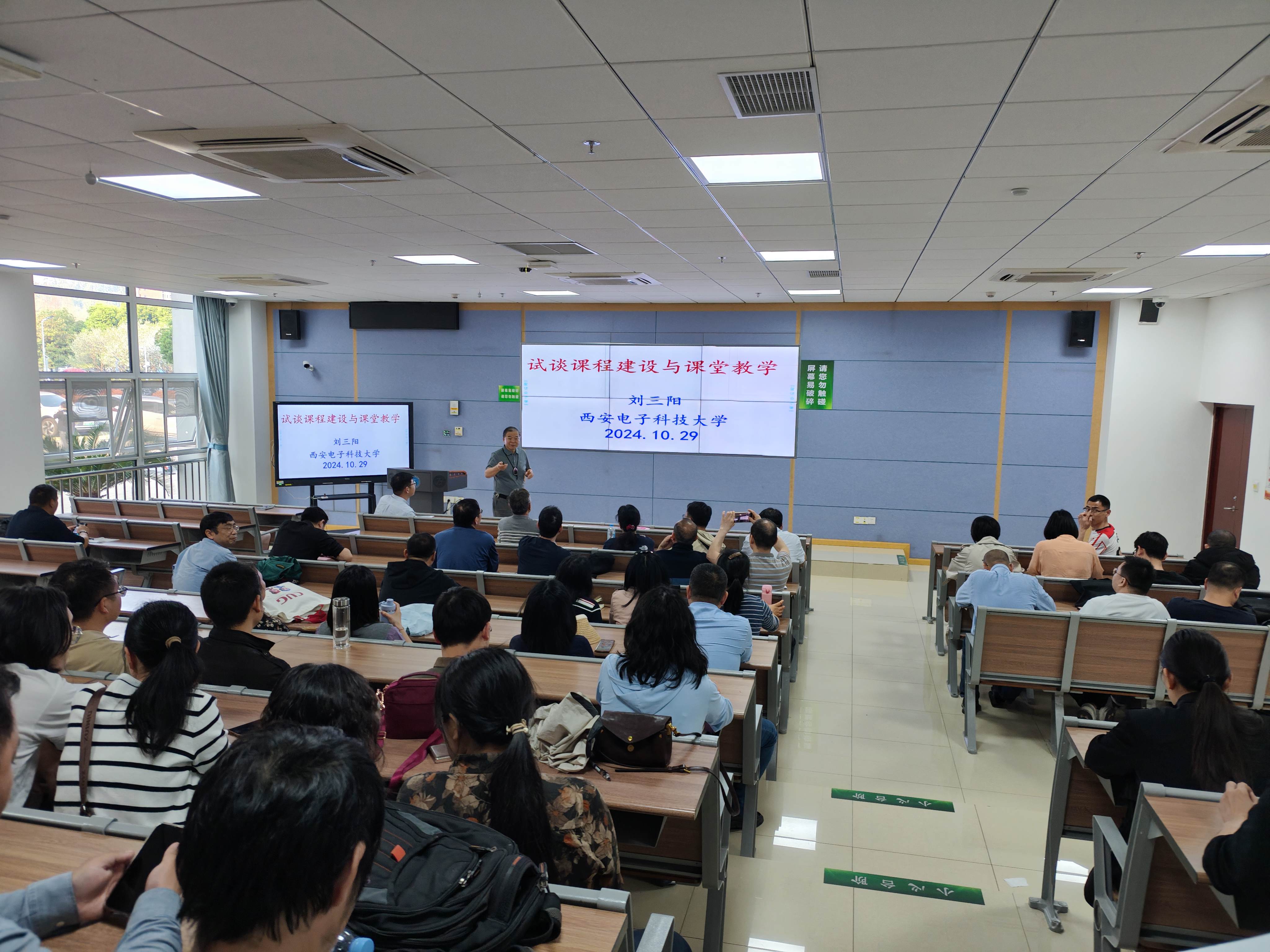 接着,刘三阳教授在东区教学综合楼C0106室为数学与物理学院全体教师又带来了《试谈课程建设与课堂教学》的讲座。讲座由数学与物理学院院长魏周超教授主持。