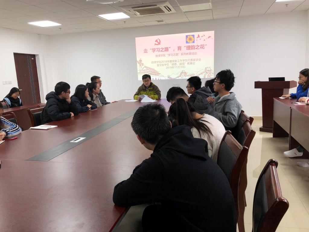 最后,孙老师布置了学院2018年受助学生“感恩、诚信”教育工作,他希望,各位受助学生代表能够积极发挥榜样作用,讲求诚信,心存感恩,用实际行动去影响周围同学。