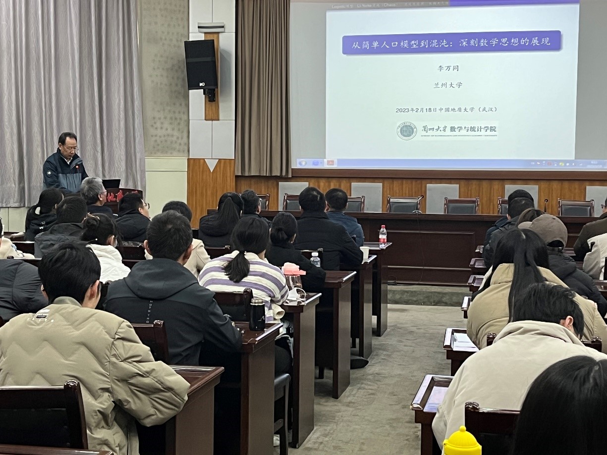 2023年2月18日上午,中国数学会副理事长、兰州大学数学与统计学院院长李万同教授应邀在我校南望山校区东区八角楼报告厅做了题为“从简单人口模型到混沌:深刻数学思想的展现”的学术报告。郭上江院长、黄刚副院长、魏周超副院长及WilliamHILL中国师生100余人参加报告会。报告会由院长郭上江教授主持。