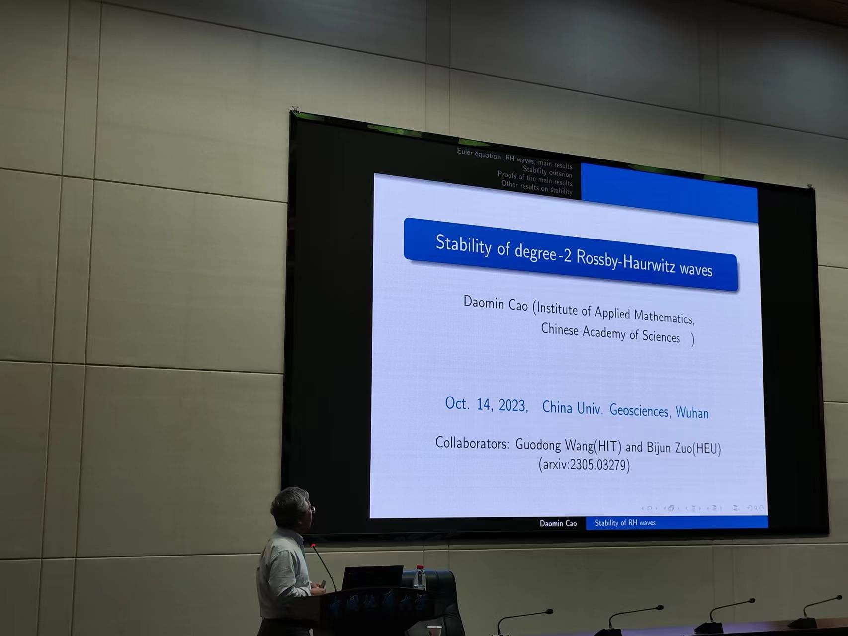 应williamhill威廉希尔数学科学中心和WilliamHILL中国邀请,国家杰出青年基金获得者、中国科学院数学与系统科学研究院研究员曹道民于2023年10月14日为中国地质大学名家论坛做了题为“Rossby-Haurwitz波的稳定性”的学术讲座,我院相关研究领域的老师和学生参加了本次学术讲座。