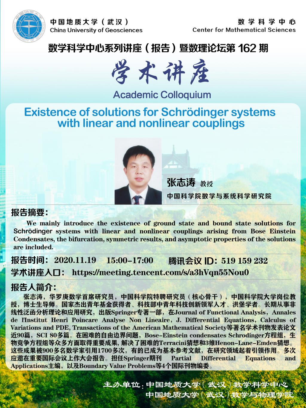 "数理论坛"第162期暨数学科学中心系列讲座(报告):Existence of solutions for Schrodinger systems with linear and nonlinear couplings