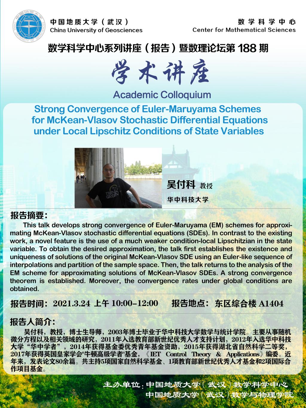 "数理论坛"第188期暨数学科学中心系列讲座(报告):Strong Convergence of Euler-Maruyama Schemes for McKean-Vlasov Stochastic Differential Equations under Local Lipschitz Conditions of State Variables