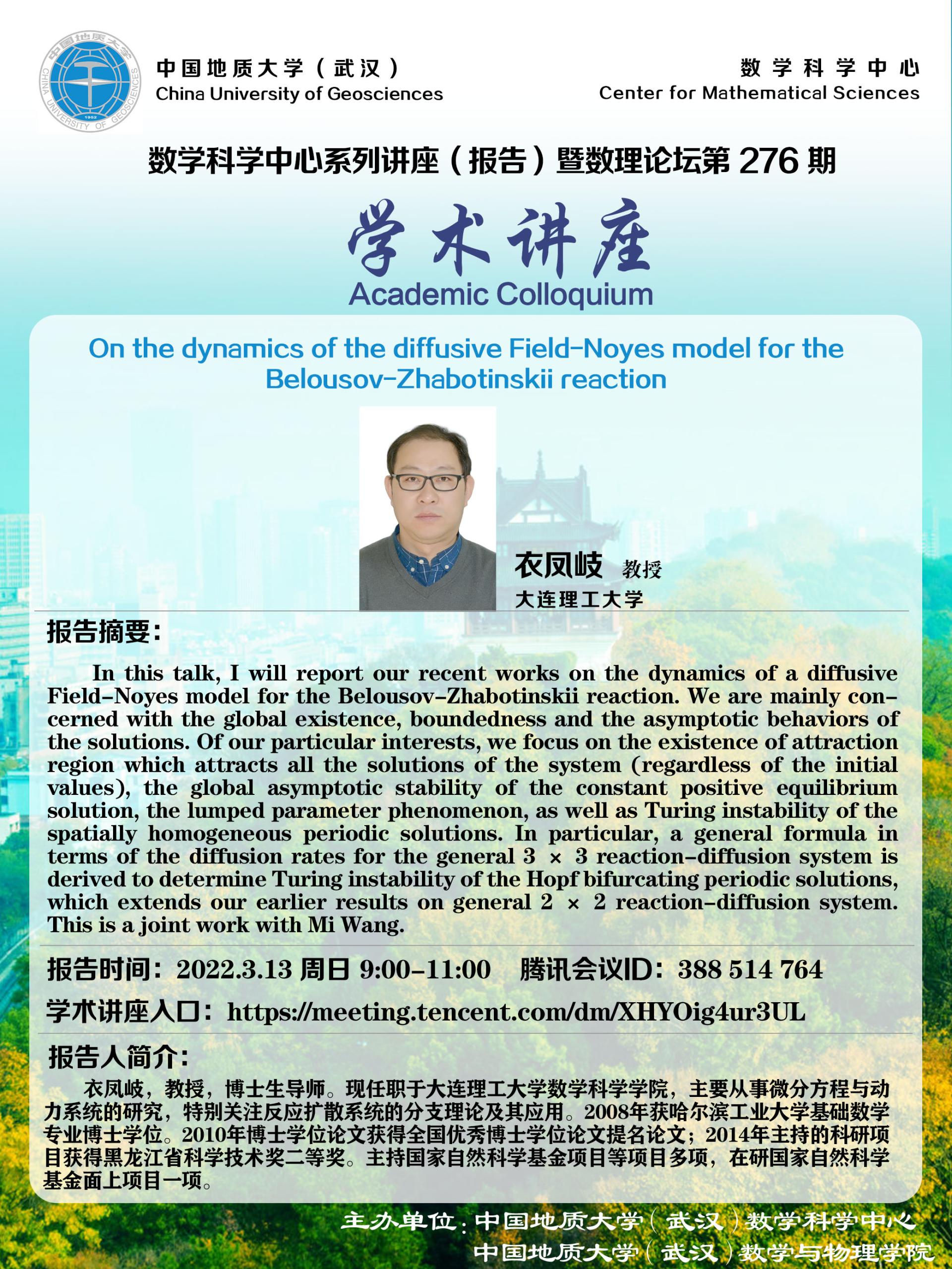 "数理论坛"第276期暨数学科学中心系列讲座(报告):On the dynamics of the diffusive Field-Noyes model for the Belousov-Zhabotinskii reaction