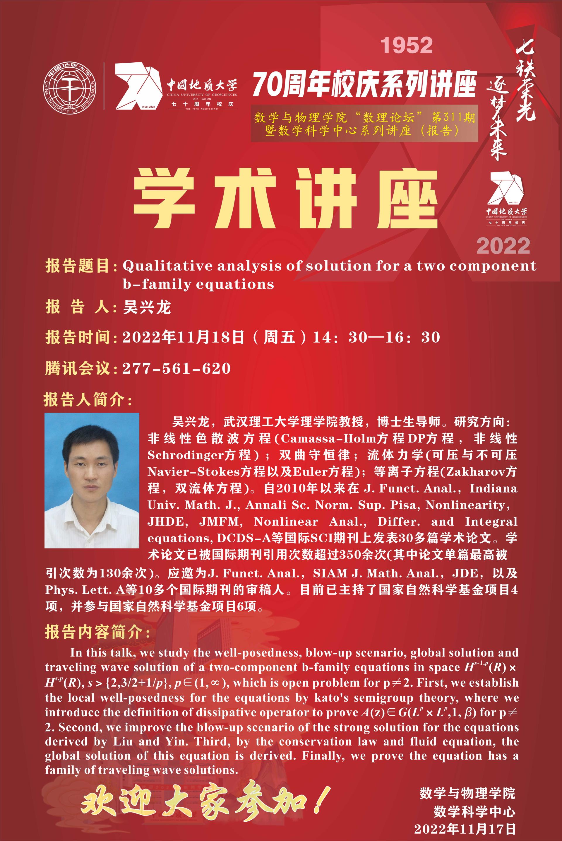 "数理论坛"第311期暨数学科学中心系列讲座(报告):Qualitative analysis of solution for a two component b-family equations