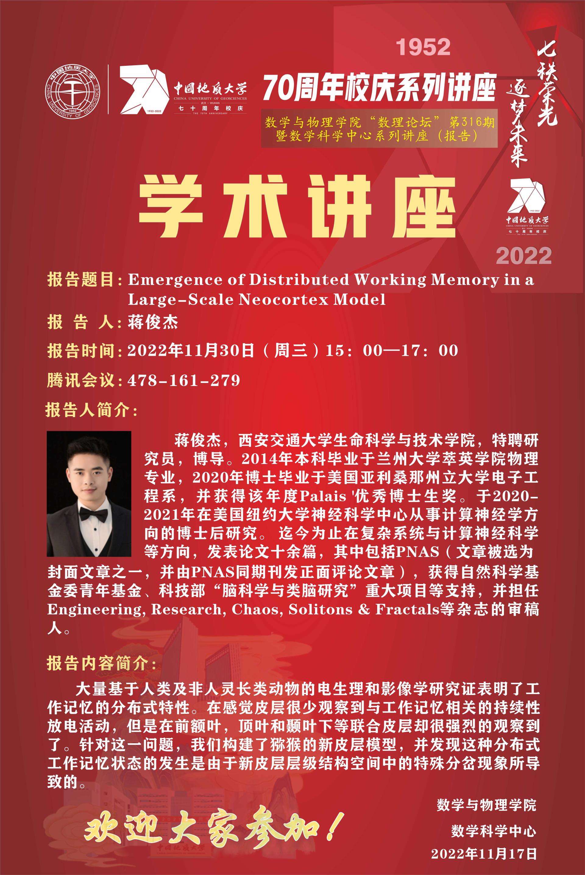 "数理论坛"第316期暨数学科学中心系列讲座(报告):Emergence of Distributed Working Memory in a Large-Scale Neocortex Model